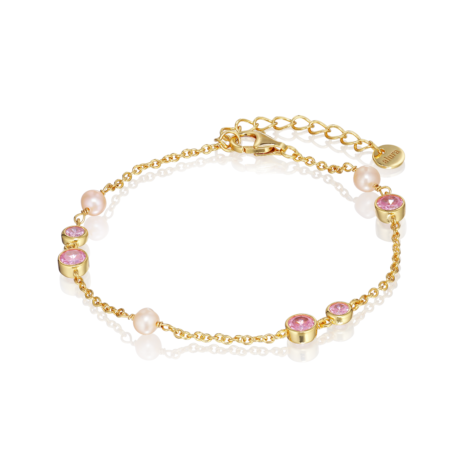 De armband is ontworpen met een fijne ketting van verguld sterlingzilver, waarbij een zoetwaterparel en een fonkelende gefacetteerde zirkonia een mooi en uitgebalanceerd centraal motief vormen. De combinatie van de parel en de steen geeft een elegant lichtspel en zorgt voor een stijlvolle expressie rond de pols.