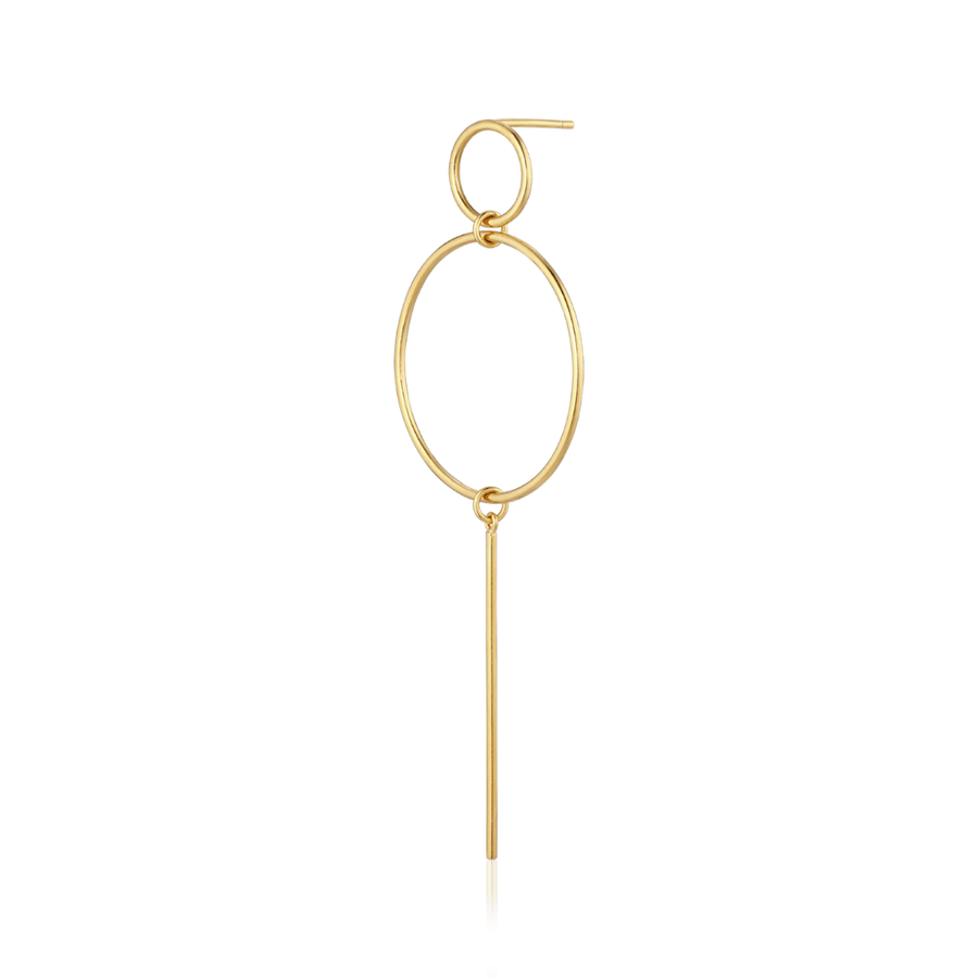 De oorbel is ontworpen met twee lichte ringen die een mooi en luchtig silhouet creëren. Uit de grote ring valt een slanke hanger, die de oorbel een elegante lengte geeft en een fijne beweging geeft tijdens het dragen. Het vergulde oppervlak geeft het stuk een stijlvolle en vrouwelijke uitstraling.