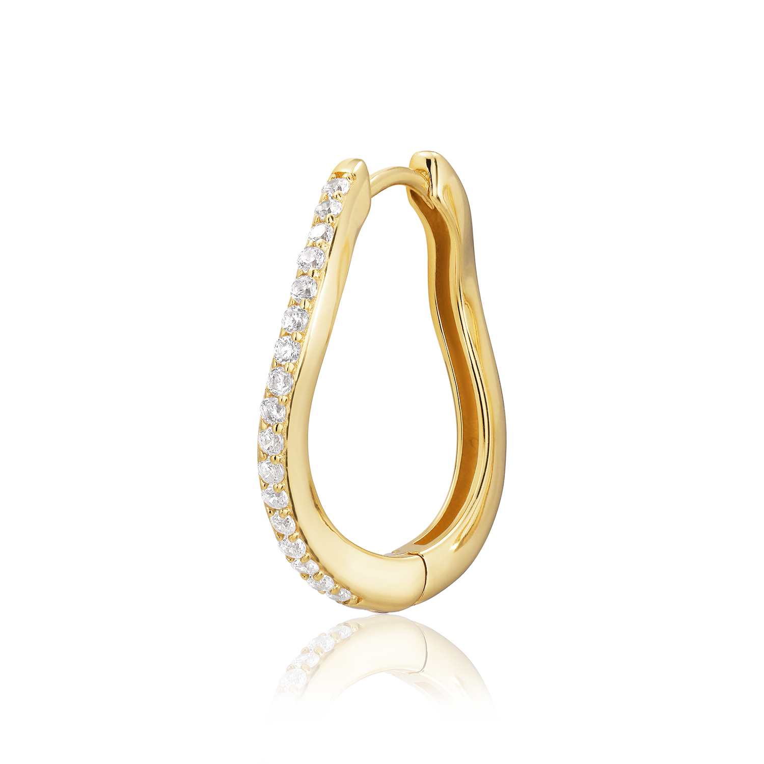 De oorbel is ontworpen als een zachte, druppelvormige hoepel, waarbij een reeks gefacetteerde zirkonia de voorkant volgt en een prachtig, sprankelend lichtspel creëert. De heldere stenen geven een elegante en exclusieve uitstraling, terwijl het warme vergulde oppervlak in 18-karaats goud het vrouwelijke en klassieke design van het stuk benadrukt.