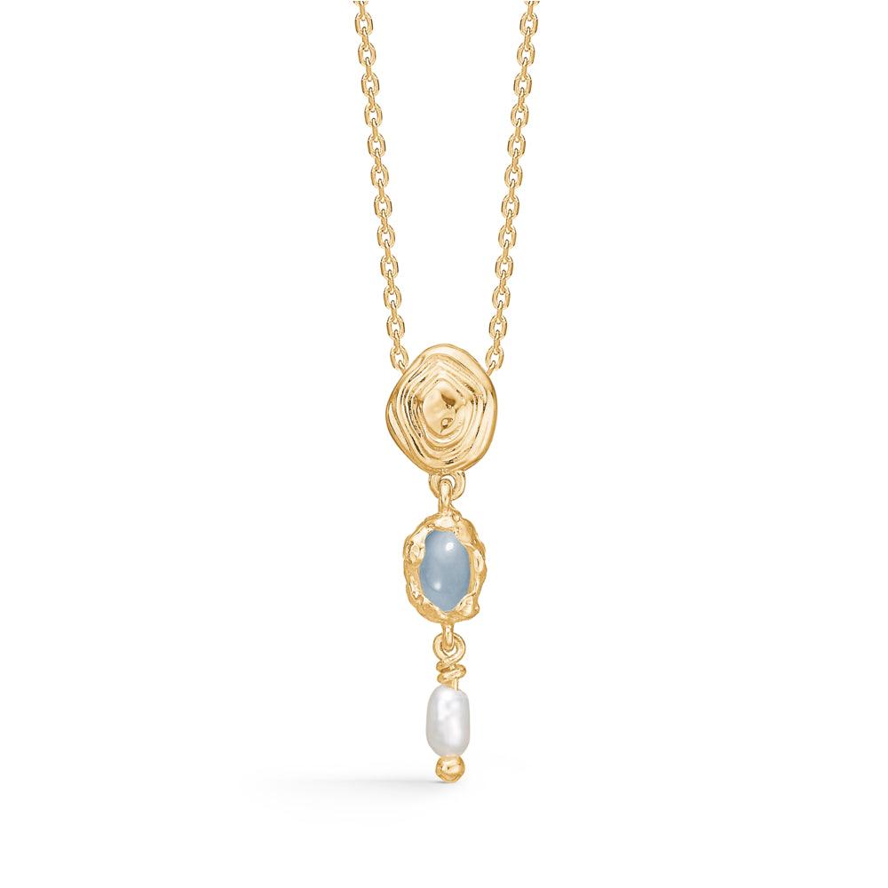 De Shell-ketting is een juweel geïnspireerd op de magie van de zee. De blauwe zirkonia vertegenwoordigt de diepten van de zee, terwijl de parel de verborgen schatten in de binnenste cache symboliseert. Het vergulde zilverframe omringt de stenen en parel als een liefdevolle omhelzing, gemaakt met zorg en precisie.