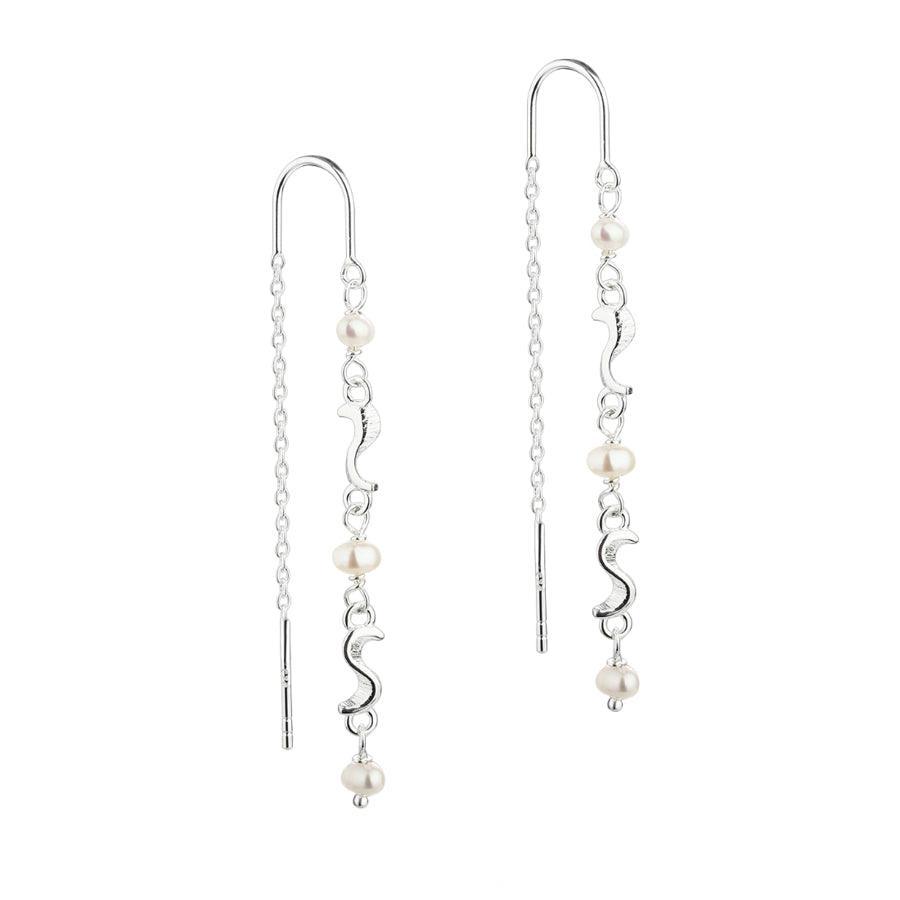 Leuke elegante draadoorbellen met fijne zoetwaterparels met kleine Rhumba hangers in zilver, heerlijk te combineren met een paar kleine Rhumba oorstekers, ze komen van Aqua Dulce.