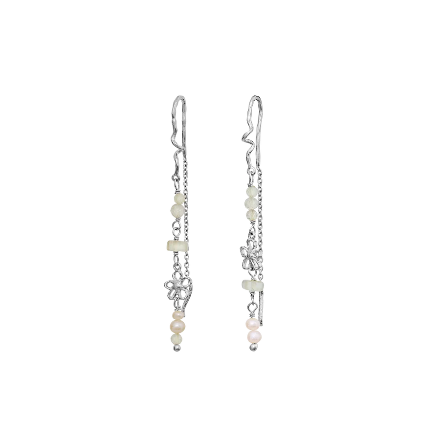 Designet er en kædeørering på bøjle, der giver et let og luftigt fald. Kombinationen af den kølige sølvglans, den bløde ferskvandsperle og den sarte prehnit skaber et poetisk og naturligt udtryk. En del af Maanesten SS26 kollektionen med fokus på organiske former og sommerlig lethed.
