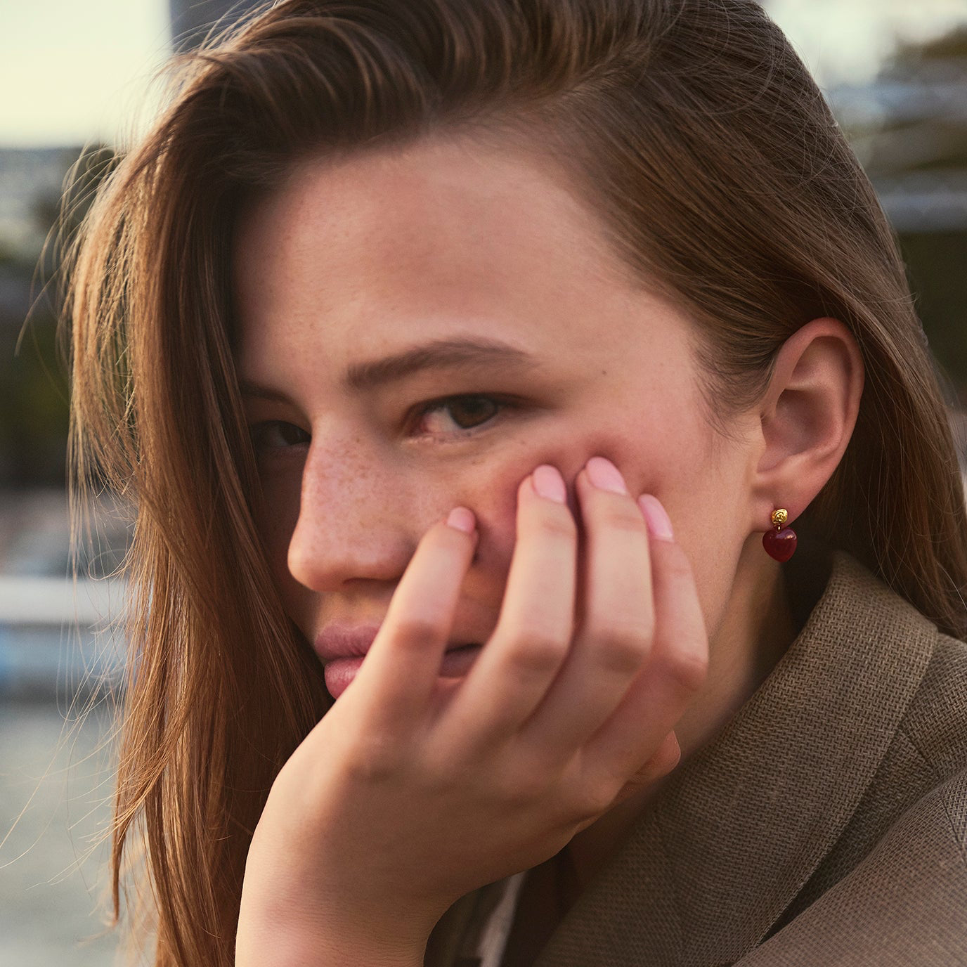 Den røde jade giver et smukt strejf af farve og symboliserer kærlighed og passion, hvilket gør Rubina Heart Øreringene til et oplagt valg som en personlig og betænksom valentinsgave til hende – eller som en lille kærlighedserklæring til dig selv. Designet balancerer elegant mellem sødme og sofistikeret enkelhed.