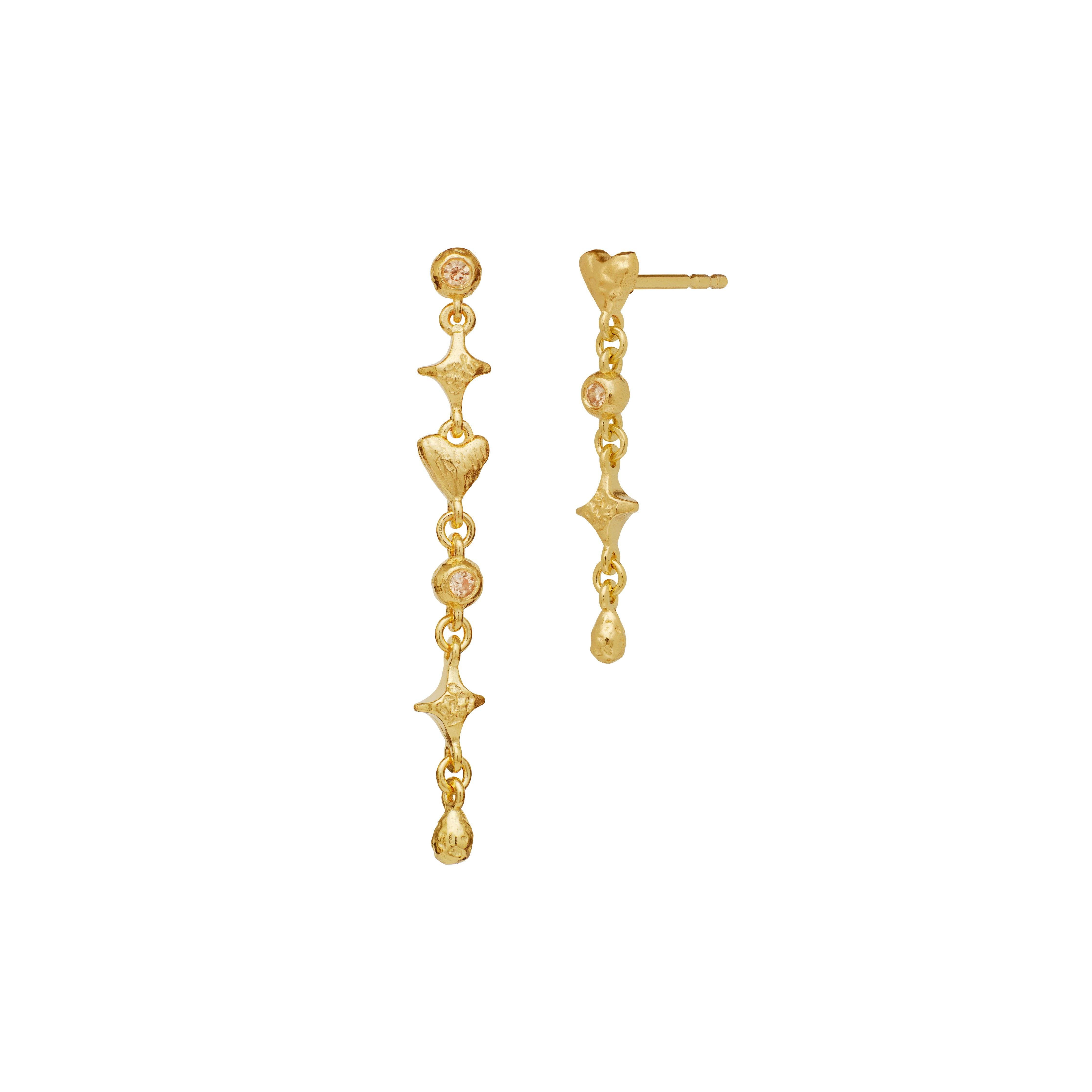 Maansteen Isidora Oorbellen kanaliseren de magische energie, waarbij elke druppel de essentie van het leven en de kracht van creativiteit met zich meedraagt. De oorbellen zijn gemaakt van 18kt verguld 925 sterling zilver en versierd met champagne zirkonia. Het ontwerp, dat harten, sterren en druppels combineert, symboliseert liefde, licht en de mysteries van het leven. De oorbellen hebben een lengte van 122 mm en een breedte van 4,4 mm, wat ze een opvallende en magische uitstraling geeft.