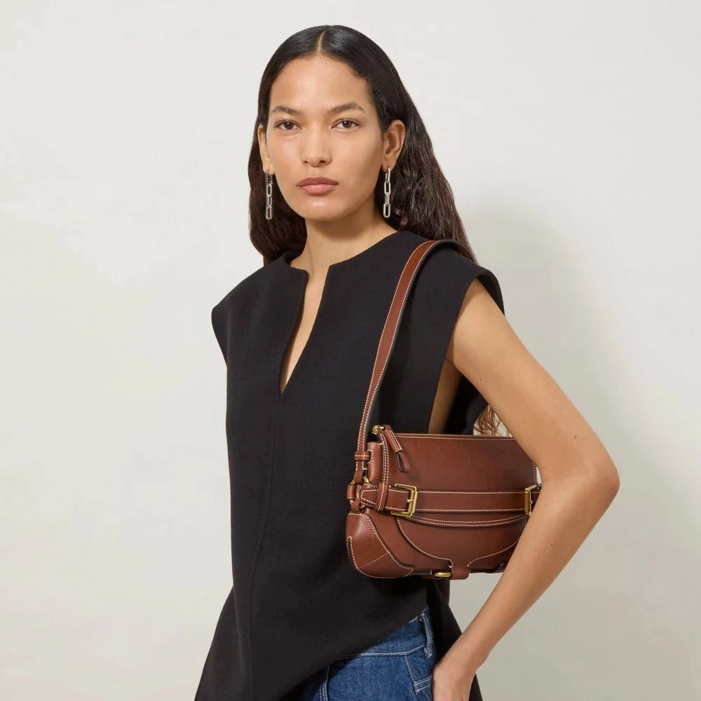 - Details: Ontwerp met riem en dubbele gesp, ringdetails, schouderhoogte 25 cm