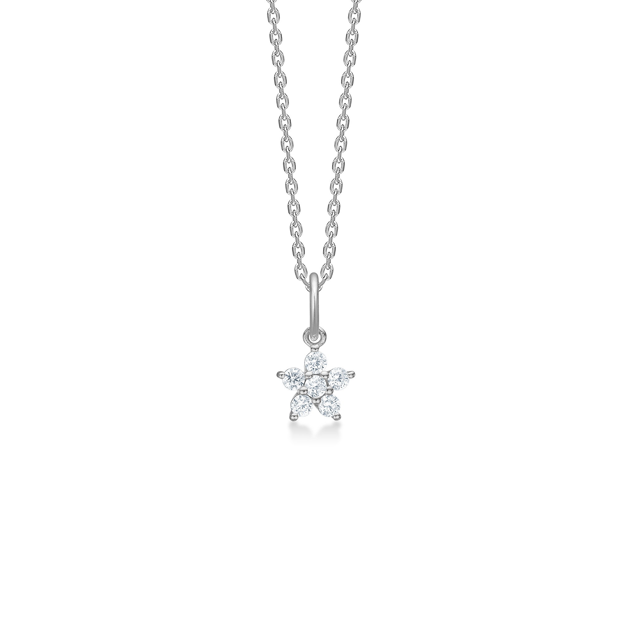 De Céleste ketting is een elegant en vrouwelijk zilveren sieraad met een rustige, harmonieuze uitstraling. Het gedetailleerde rozetmotief meet 7 mm en is gestructureerd als een vijfpuntige ster, waarbij gefacetteerde zirkonia het licht dicht bij de huid opvangt. Samen met het gepolijste sterlingzilver creëren de stenen een mooi en discreet lichtspel.