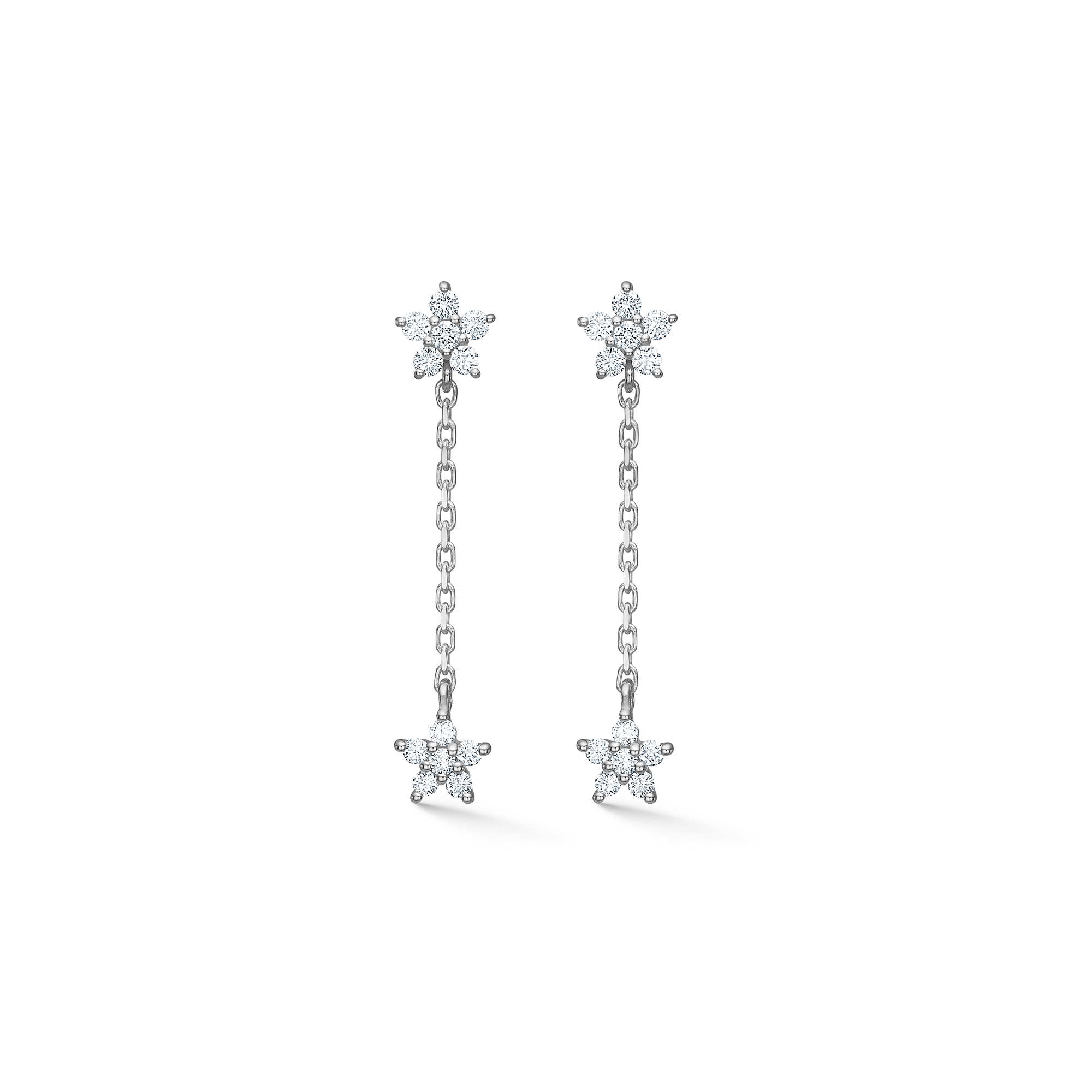 De ene ster zit voor het oor, de andere achter de oorlel. De smalle ketting verbindt ze met elkaar en geeft een discrete, levendige uitstraling. Het gepolijste zilver benadrukt de Scandinavische eenvoud en geeft de oorbellen een moderne en grafische uitstraling, die toch zacht en vrouwelijk aanvoelt.