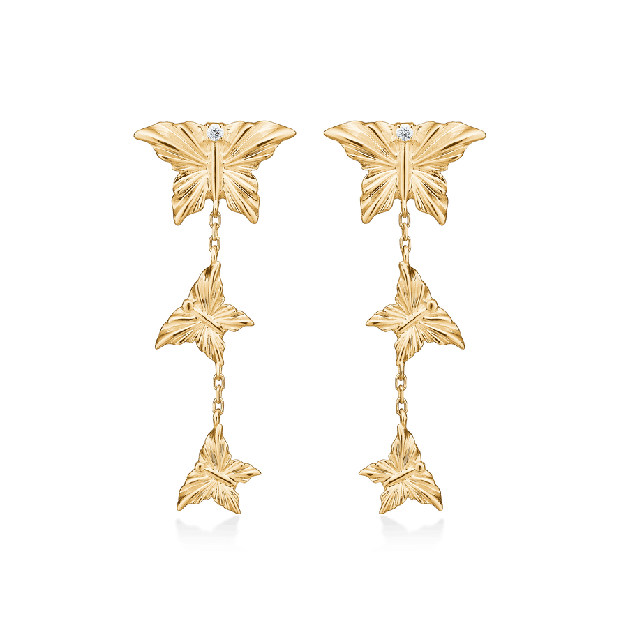 De MONARCH oorbellen zijn geïnspireerd op de sierlijke monarchvlinder, een symbool van transformatie en vrijheid. Ze zijn gemaakt van 14 karaats goud en versierd met 0,024 ct. briljanten W.SI. De oorbellen hebben een prachtig design met fijne vlindervormige hangers die elegant aan een kettinkje hangen. De Monarch-sieraden herinneren aan de innerlijke kracht en schoonheid die elke vrouw bezit en symboliseren de kracht die haar tot heerser over haar eigen leven maakt.