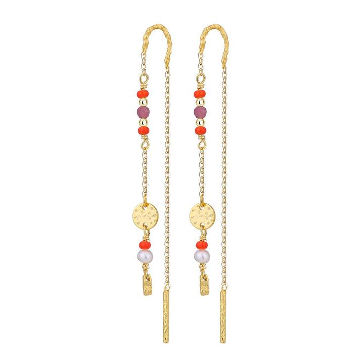 De Saphira oorbellen in verguld zilver van Wioga is een prachtige kettingoorbel, met een mooie kleurenmix van stenen, parels en emaille.