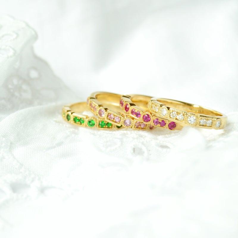 De Trine Ji ring komt uit de Scandinavische Simplicity collectie. In de ring zit een rij van 10 prachtige lichtroze saffieren. Door het ontwerp van de ring is hij gemakkelijk te combineren met andere ringen.