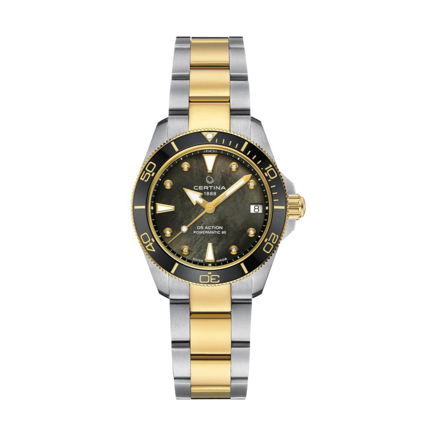 Stijlvol maar rustiek duikhorloge uit de Action-serie van Certina met zwarte wijzerplaat en keramische kroon. Het horloge heeft een omtrek van slechts 34,5 mm en is daarmee geschikt voor de vrouw die een mooi kwaliteitshorloge wil. Het horloge heeft een schroefkroon en is waterdicht tot 300 meter, waardoor het horloge gebruikt kan worden tijdens het duiken. De diamanten op de wijzerplaat en de zwarte parelmoeren wijzerplaat geven een heerlijk vrouwelijke uitstraling. Op de wijzerplaat bevinden zich de wijzers en enkele uurmarkeringen met super LumiNova waardoor deze oplicht in het donker. Een absoluut fantastisch horloge voor de actieve buitenmens.