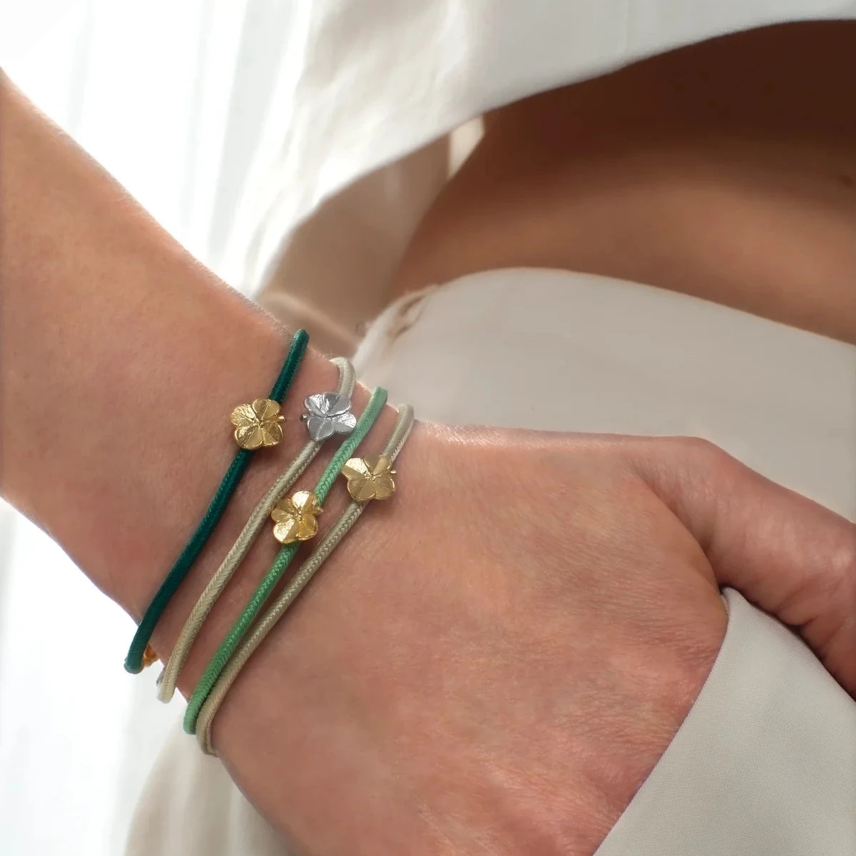 Flora Danica De zijden klavertje vier-armband in donkergroen en 22-karaats verguld zilver is een uniek eerbetoon aan de Deense en Japanse cultuur, met zorg gemaakt door bekwame vakmensen in Kyoto, de stad met een eervol verleden als keizerlijke hoofdstad.