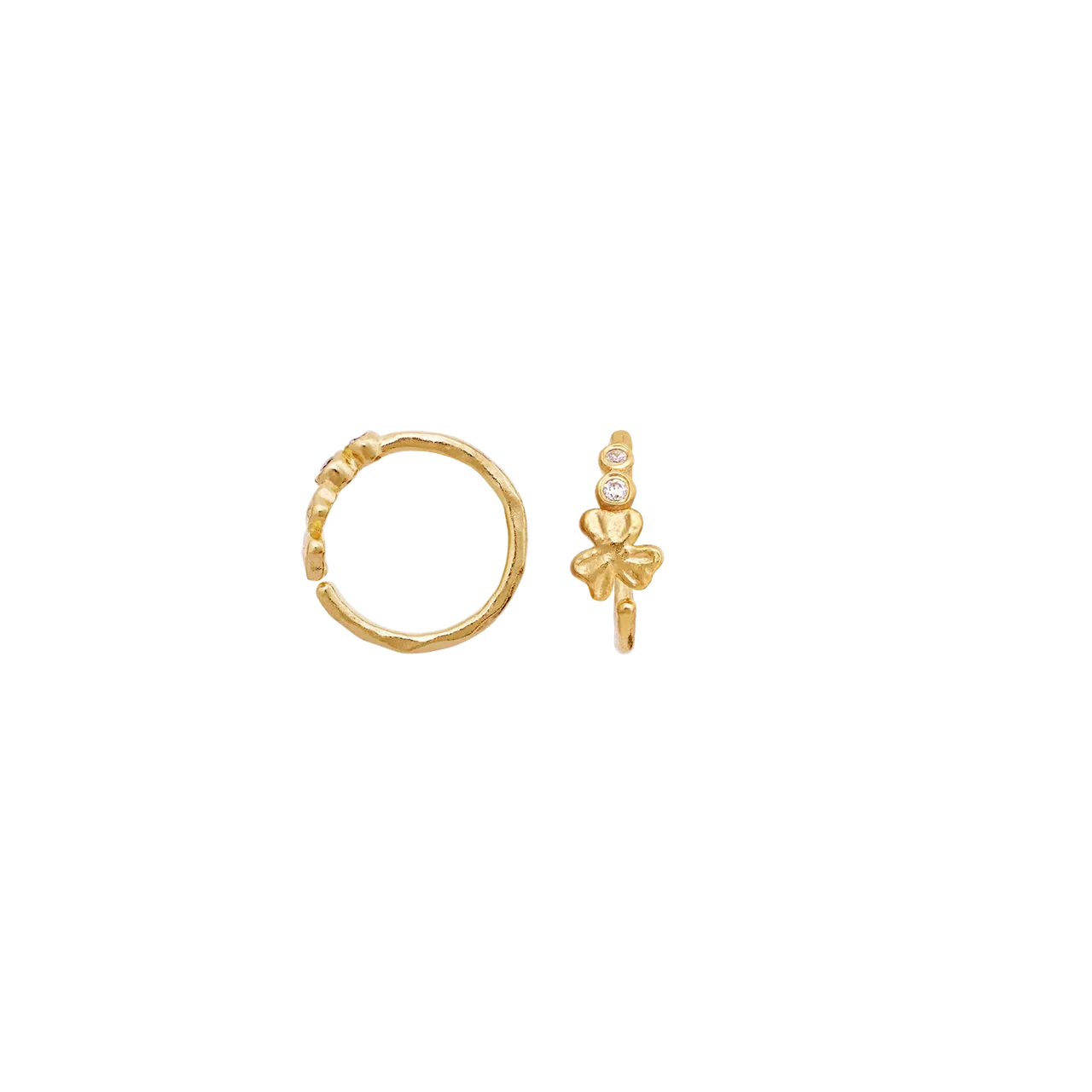 De kleine klavertjes krijgen een elegante boost door de warme, gouden vergulding en de sprankelende witte zirkonia, die een lichte en vrouwelijke uitstraling geven. De oorbellen zijn op zichzelf perfect als discreet statement - of samen met andere vergulde sieraden als je een persoonlijkere laag-op-laag-look wilt. Onderdeel van de Maanesten SS26-collectie met een focus op symboliek en fijne details.