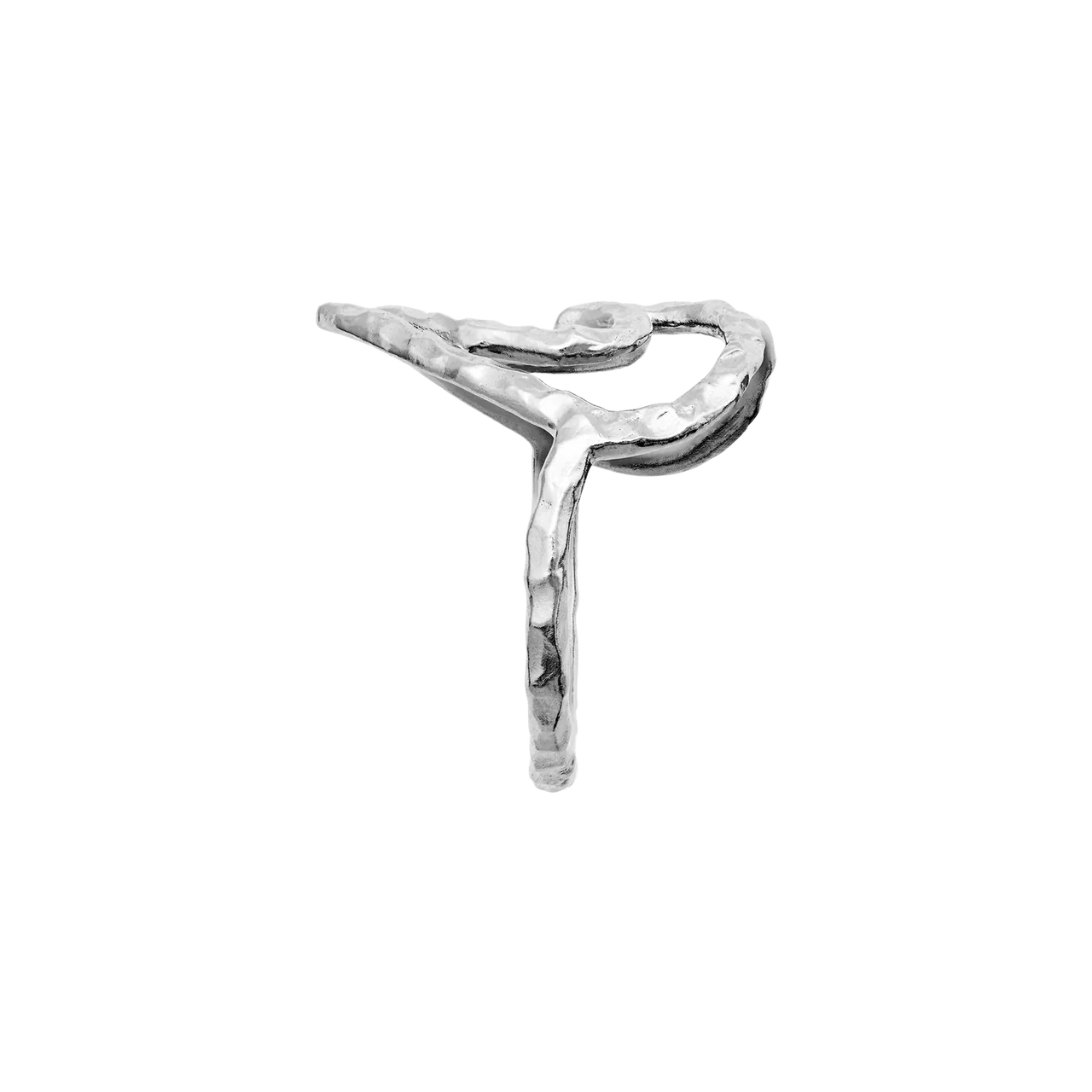 Den let hamrede overflade giver ringen et håndlavet og råt look, som balancerer det feminine hjerte-design med kant og personlighed. Ringen kan bæres alene som et blikfang eller kombineres med andre ringe for et mere moderne og personligt stacked udtryk. En del af Maanesten SS26 kollektionen med fokus på symbolik og organiske former.