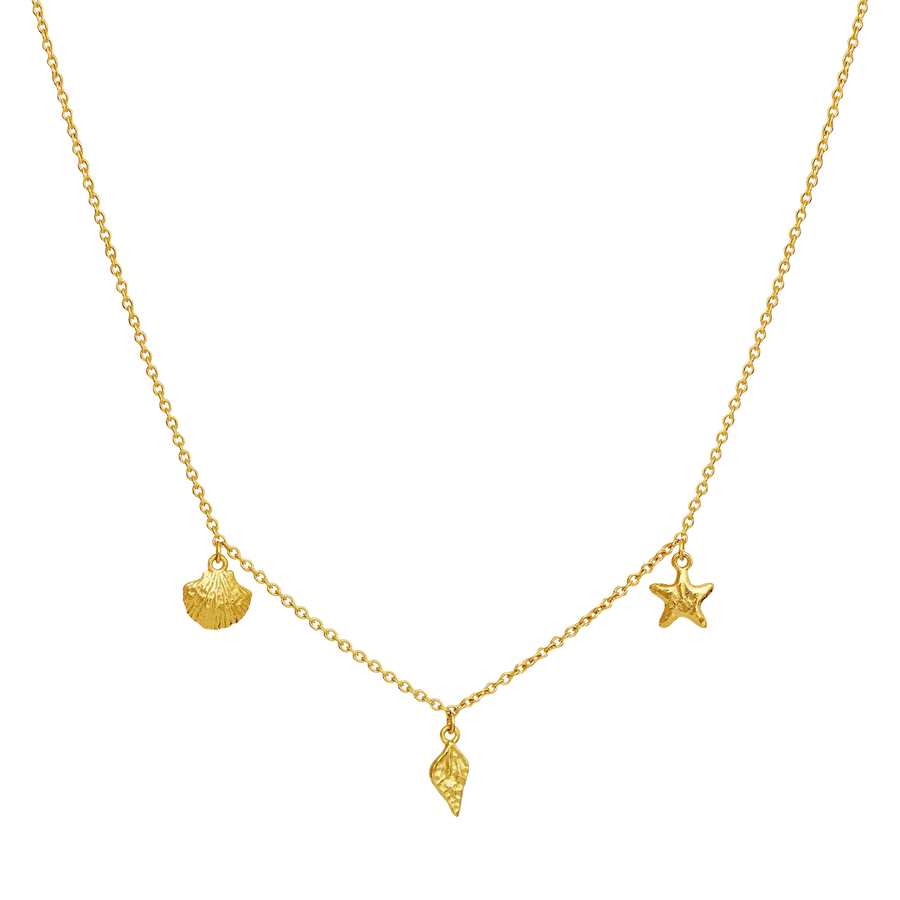 Maanesten Iluka Halskæde føles som en lille samling af skatte fundet langs havets kant. De fine vedhæng – musling, søstjerne og en lille konkylie – giver halskæden et legende og sommerligt udtryk, der emmer af sol, saltvand og ubekymrede dage.