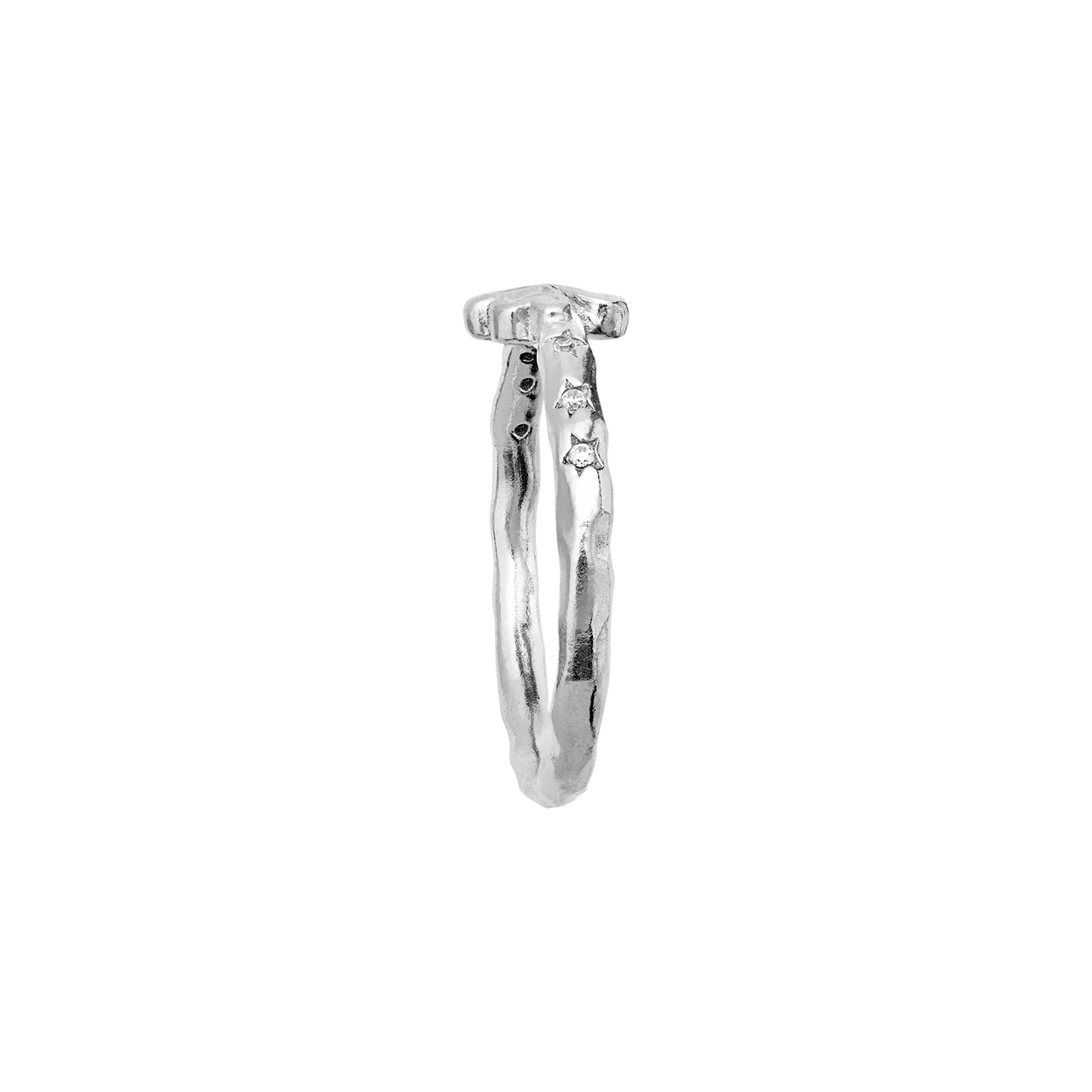 De sprankelende witte zirkonia voegt een discrete schittering toe die de ring een vrouwelijke en elegante uitstraling geeft. Perfect om alleen te dragen als klein gelukssymbool of met andere ringen voor een persoonlijkere look. Onderdeel van de Maanesten SS26-collectie met een focus op symboliek en fijne details.