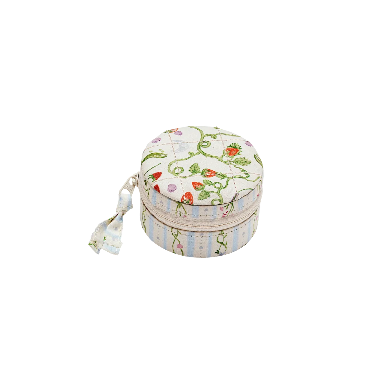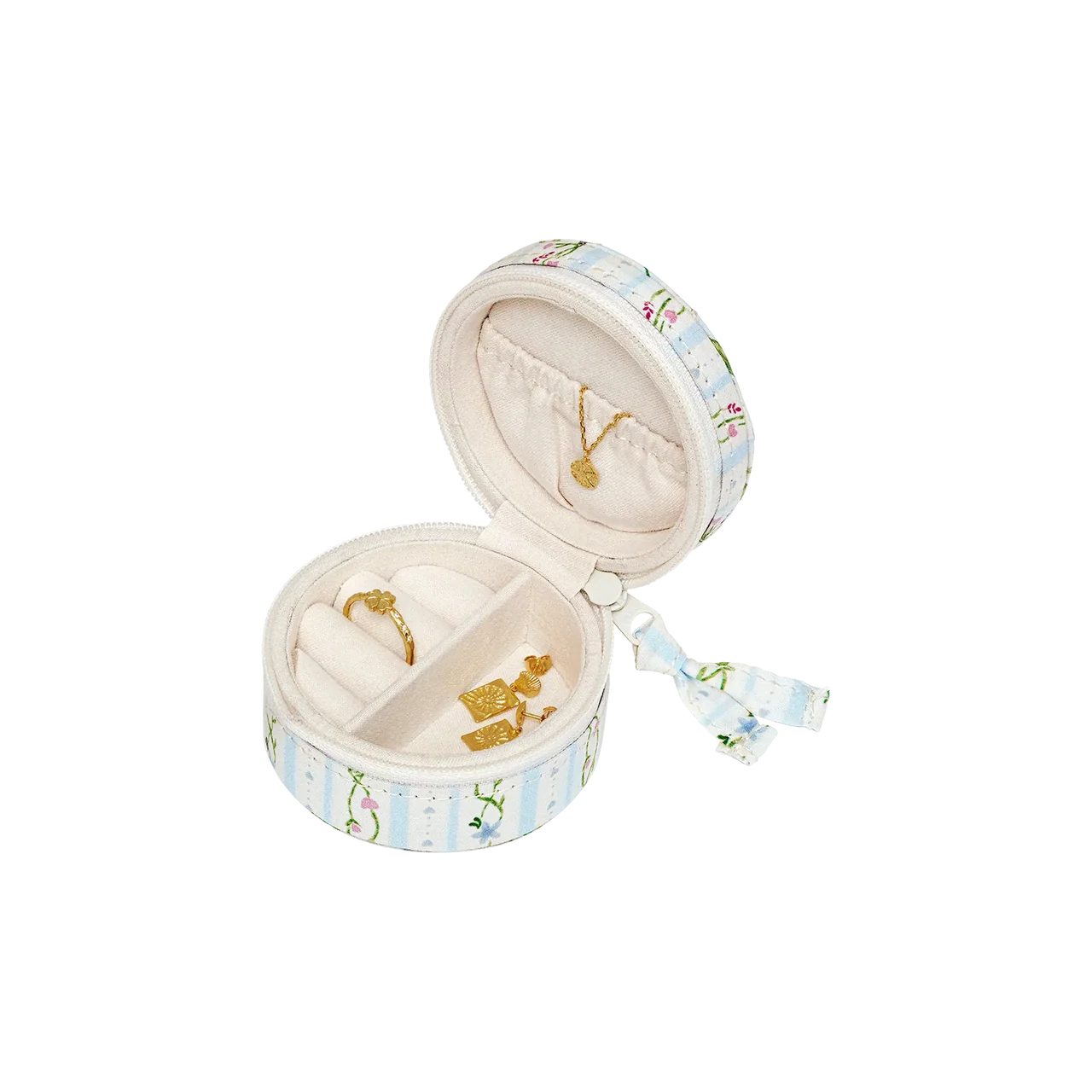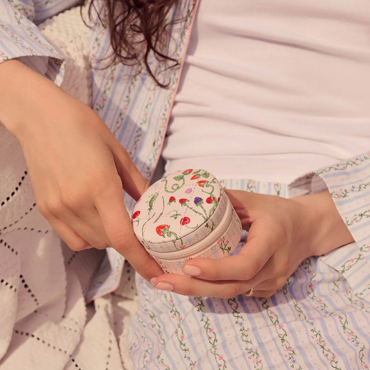 Maanesten Rond Sieradendoosje in Kleine Tuin Magic Ivory straalt zomerse nostalgie en fijne details uit. De ronde vorm en de romantische print geven een zachte en vrouwelijke uitstraling, terwijl het formaat hem gemakkelijk maakt om mee te nemen in je tas of op reis.