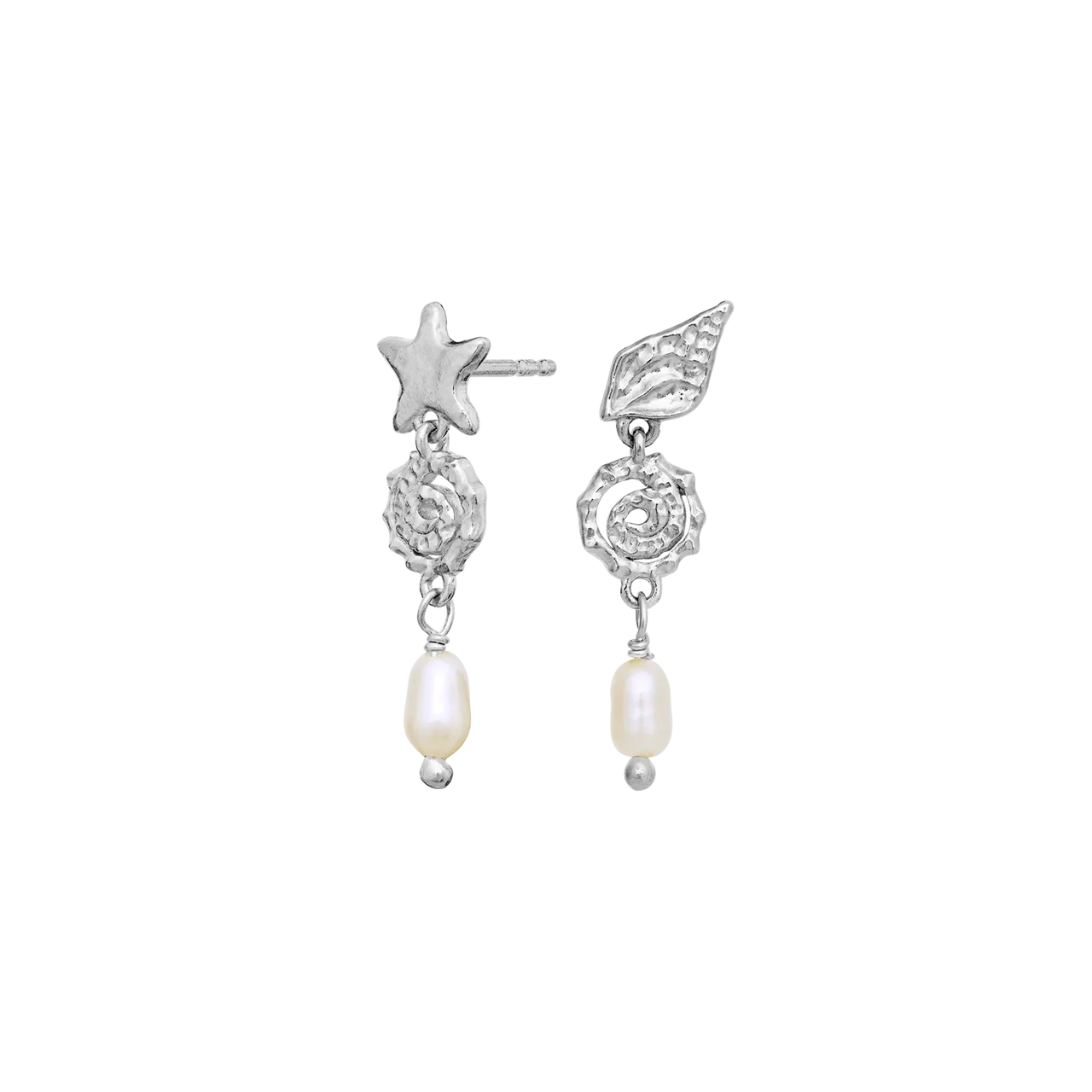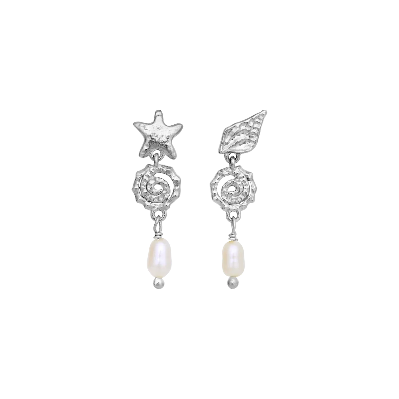 Aan de onderkant wordt het ontwerp gecompleteerd door een elegante zoetwaterparel, die zorgt voor bewegingsvrijheid en een zachte, natuurlijke glans. De koele zilveren afwerking benadrukt de structuren en zorgt voor een meer ingetogen maar toch briljante expressie. Onderdeel van de Maanesten SS26 collectie met de focus op symboliek, licht en zomerse lichtheid.