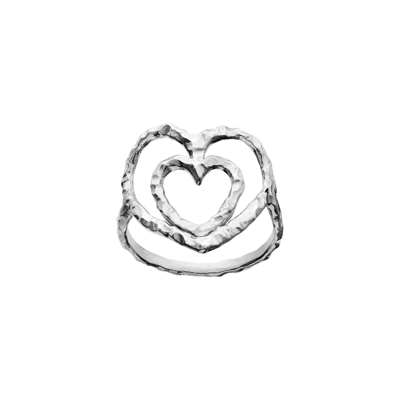Het licht gehamerde oppervlak geeft de ring een handgemaakte en rauwe uitstraling, die het vrouwelijke hartontwerp in balans brengt met scherpte en persoonlijkheid. De ring kan alleen gedragen worden als eyecatcher of gecombineerd worden met andere ringen voor een meer moderne en persoonlijke gestapelde expressie. Onderdeel van de Maanesten SS26 collectie met een focus op symboliek en organische vormen.
