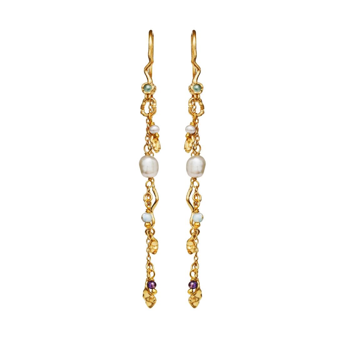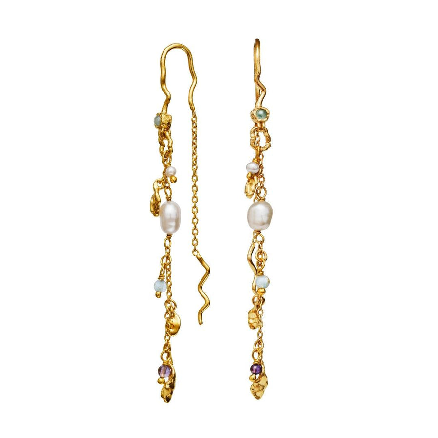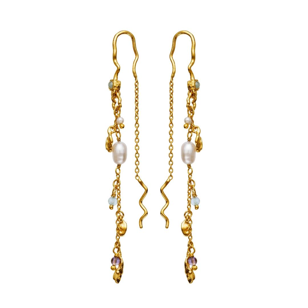 De Poppy oorbellen van Maanesten zijn een unieke en vrouwelijke sieradenkeuze. Ze hebben een unieke stijl waarbij de focus ligt op organische vormen, stenen en parels. De ketting is versierd met zoetwaterparels, synthetische aquamarijn en synthetische amethist, die samen met de fijne gedraaide gouden details voor een adembenemende look zorgen.