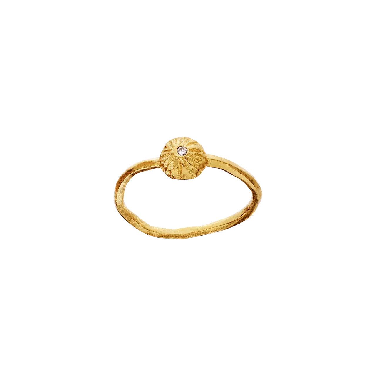 De Moonstone Tacita Ring is een fijne en poëtische ring met een kleine ronde bloem die er in miniatuur bijna uitziet als een zon. De fijne, organische structuren in het oppervlak geven de ring een levendige en handgemaakte uitstraling, terwijl de witte zirkonia in het midden een discrete en elegante glans toevoegt.