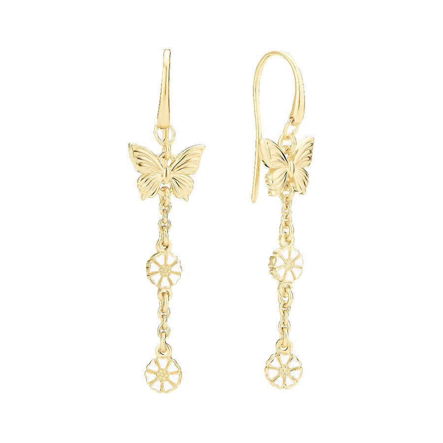 Lund Copenhagen Madeliefje oorbellen met vlinder – 2x5 mm, 24kt verguld zilver met wit emaille