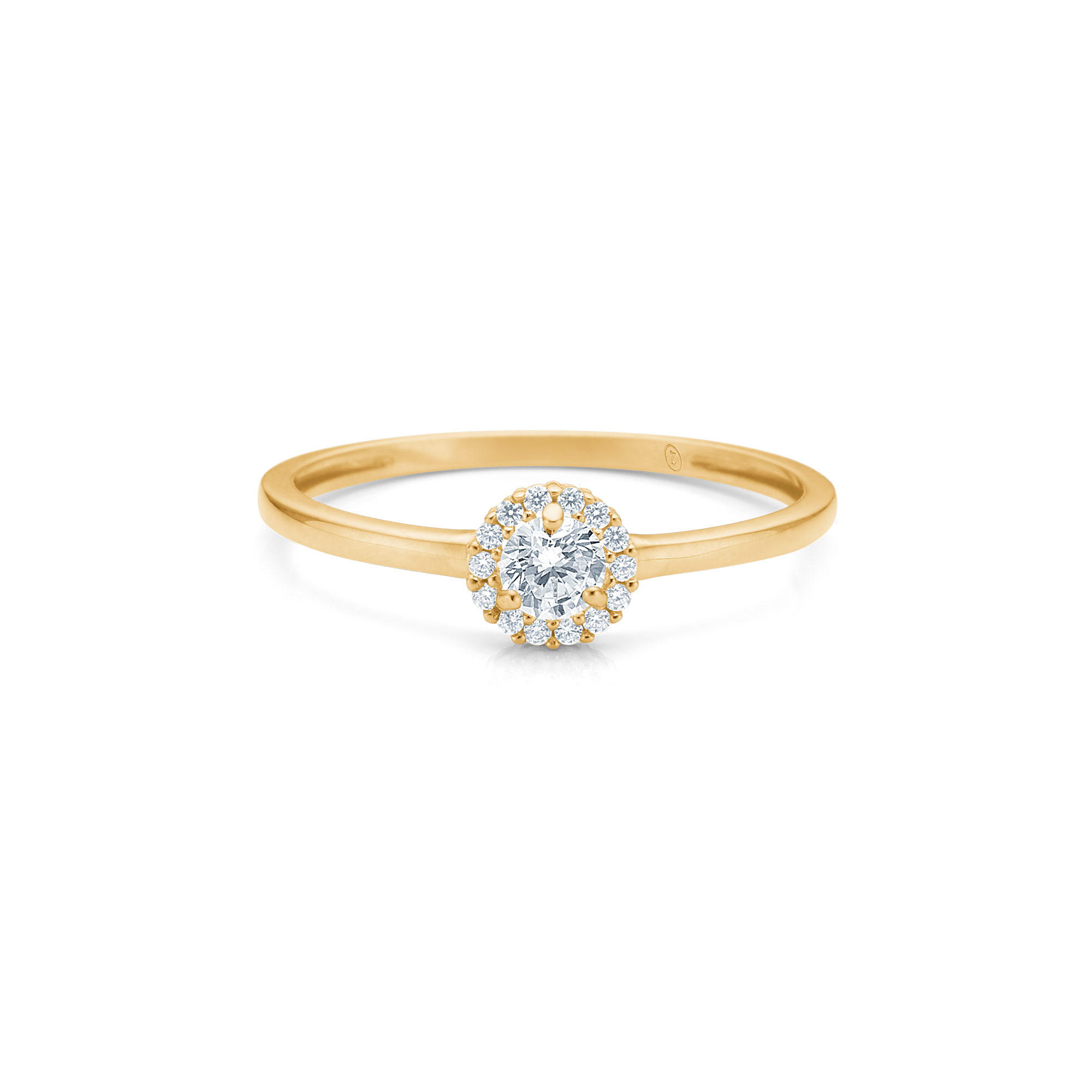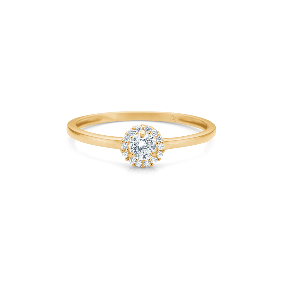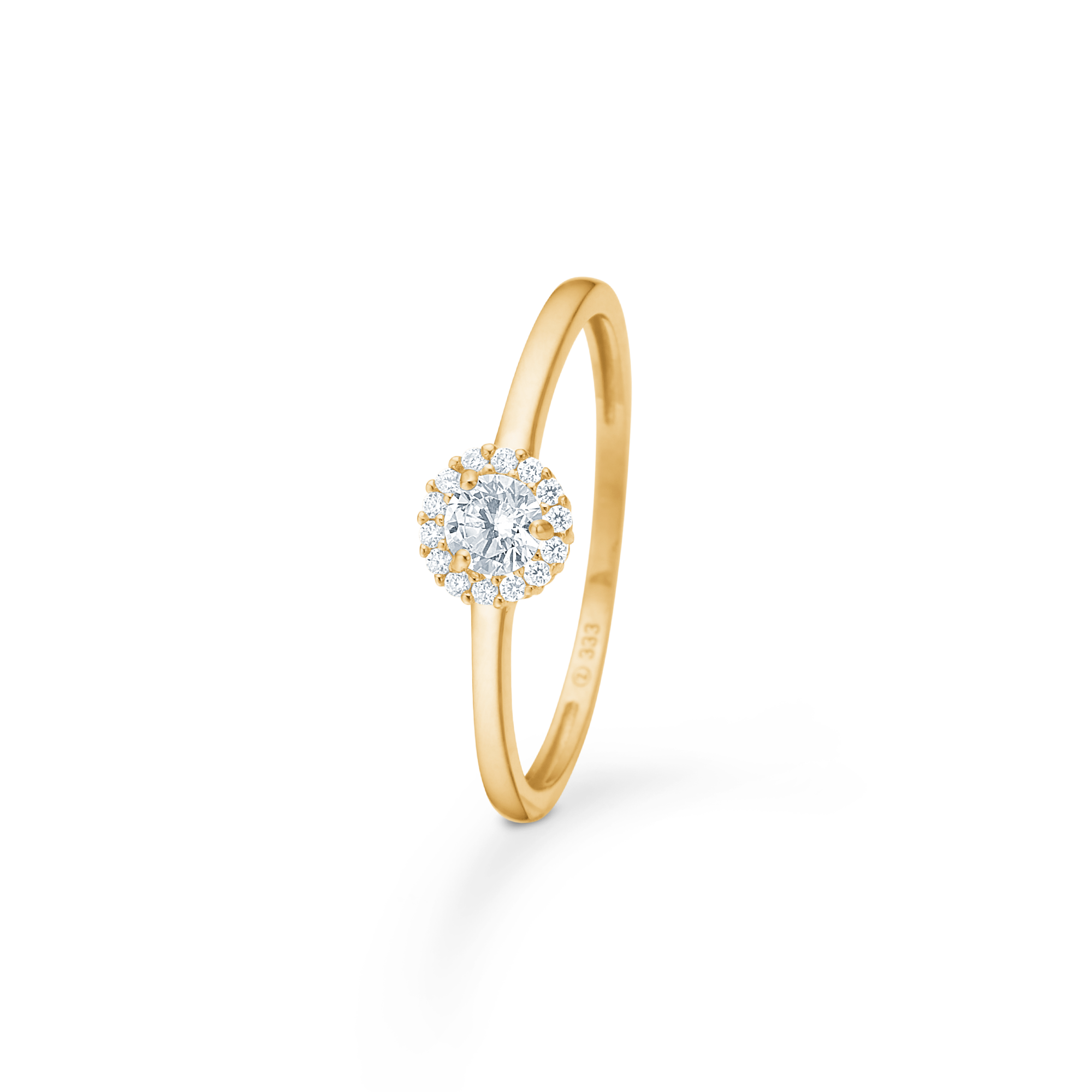 Mads Z Vega ring i 8 karat guld er en klassisk og feminin ring med et strålende centrum. Den funklende midtersten er omgivet af små zirkonia i en smuk halo, der giver ekstra lys og elegance til designet.