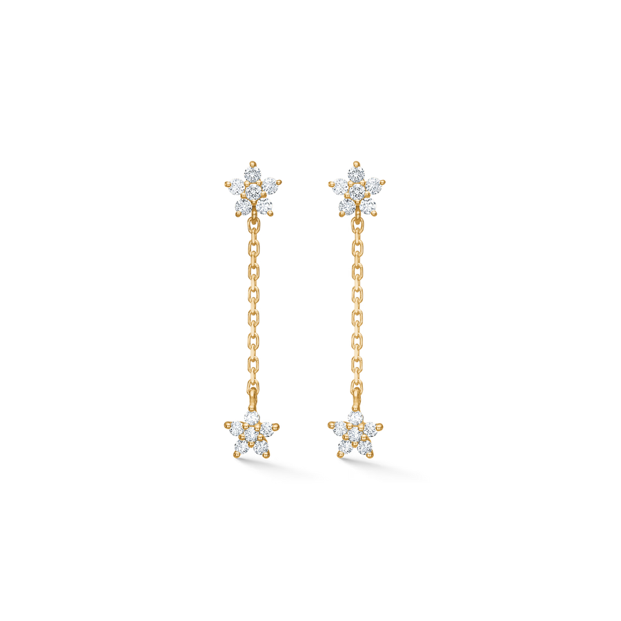 De kleine rozetten hebben de vorm van organische bloemen met zes grijpers die de stenen in een harmonieus silhouet verzamelen. Tussen de motieven zorgt een fijne ketting voor lichte beweging waardoor de diamanten vanuit verschillende hoeken het licht opvangen. Het resultaat is een levendig maar toch gebalanceerd licht dat het gezicht op een elegante manier benadrukt.