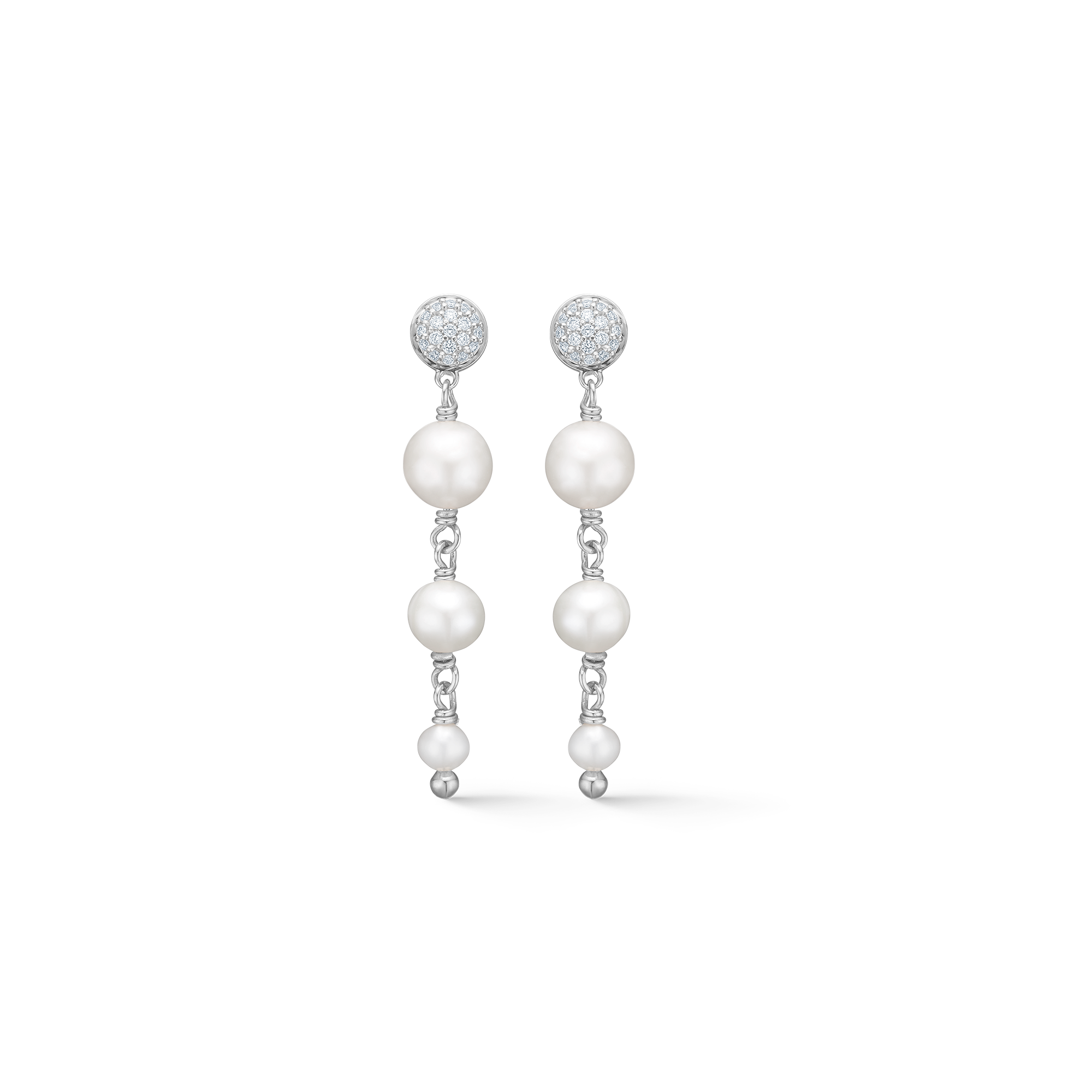 Ontdek de tijdloze schoonheid van de Z Dome-oorbellen van Mads: een paar elegante zilveren oorbellen waarin drie gegradueerde bollen een harmonieus, verticaal silhouet vormen. De oorbellen combineren gepolijst sterlingzilver, zachte gekweekte parels en sprankelende gefacetteerde witte topazen, die samen een vrouwelijke en moderne uitstraling creëren.