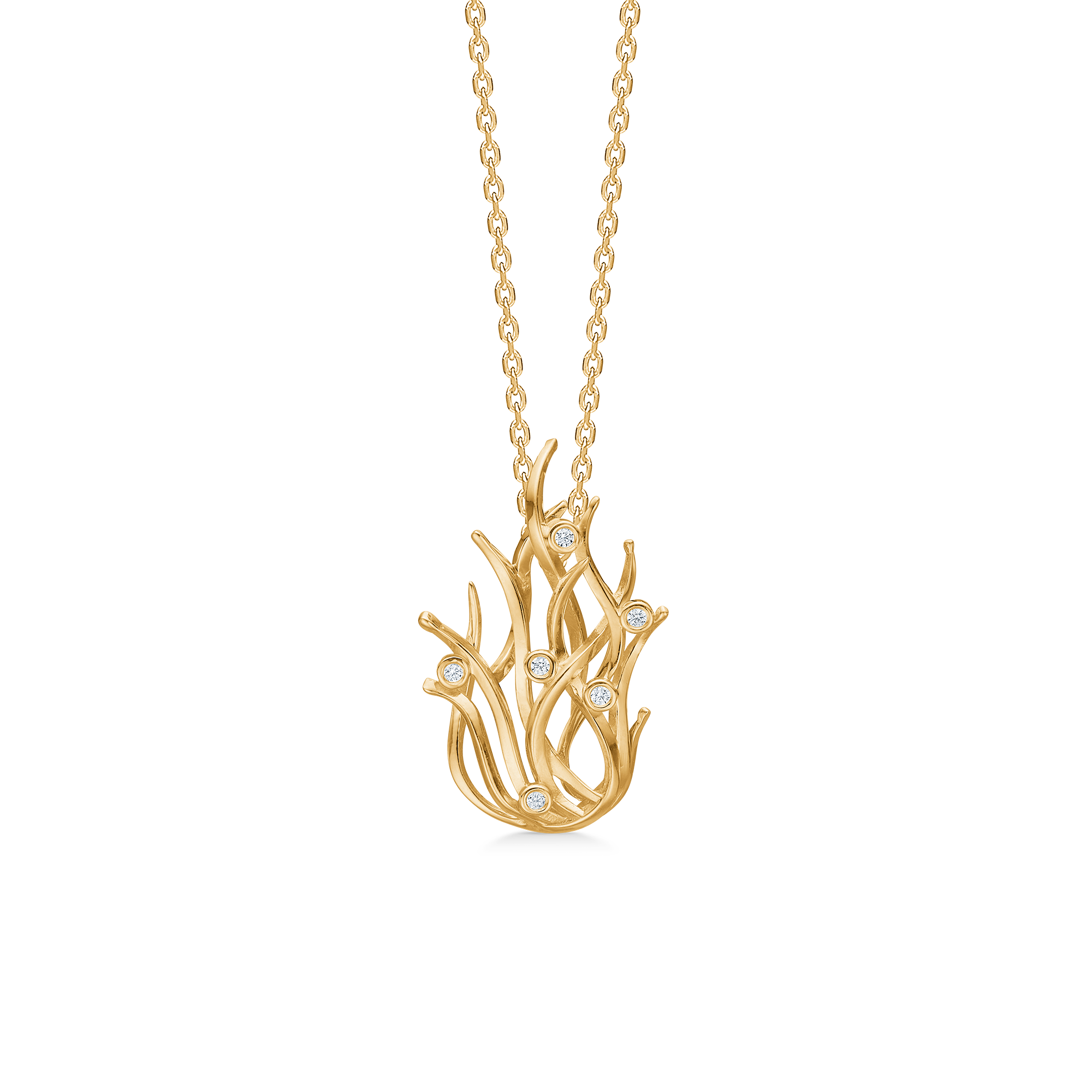Mads Z Reef-hanger in 8-karaats goud is geïnspireerd op de prachtige koraalformaties van de zee. Het organische ontwerp kronkelt elegant en creëert een levend silhouet, waarbij kleine fonkelende zirkonia's als fijne lichtflitsen tussen de zachte takken worden omlijst.