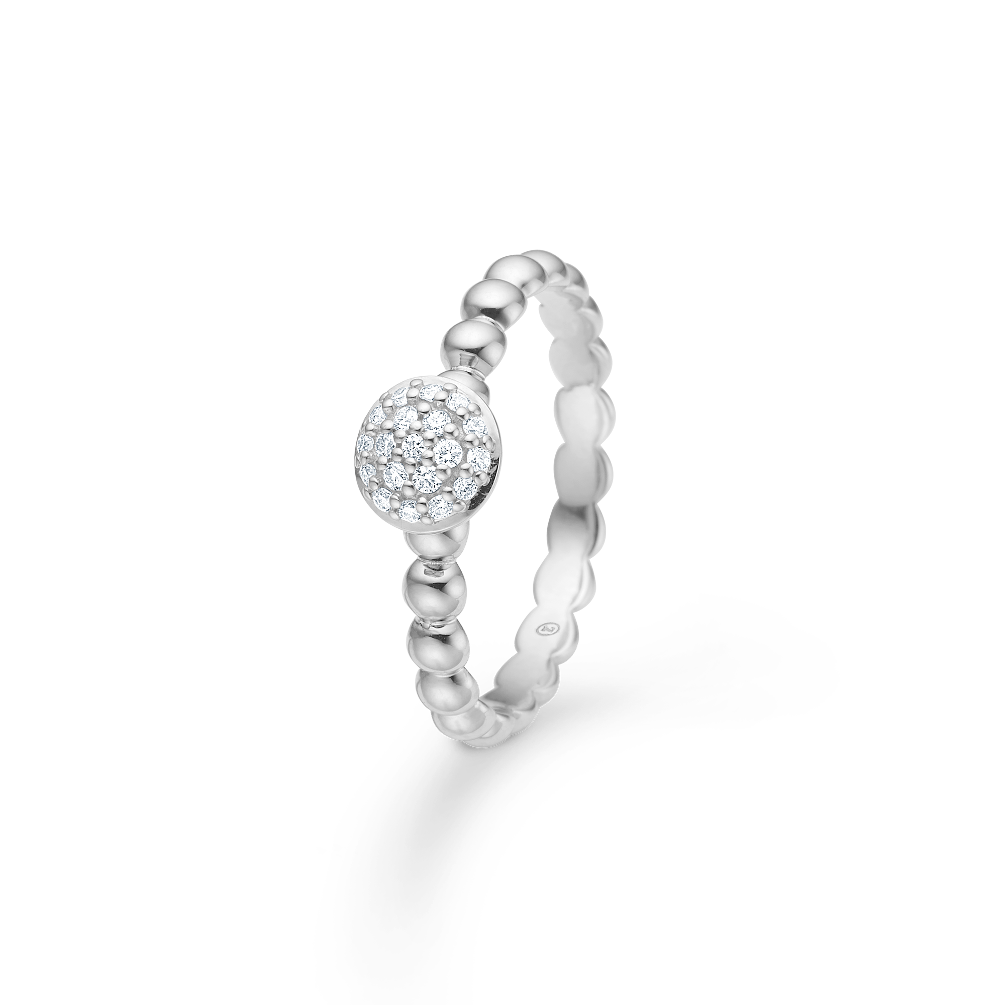 Elegante ring van sterling zilver met witte topaas pavé gezet op een koepelvormig oppervlak en gemonteerd op een sculpturale, bolvormige band. De ring combineert geometrische moderniteit met tijdloos vakmanschap.