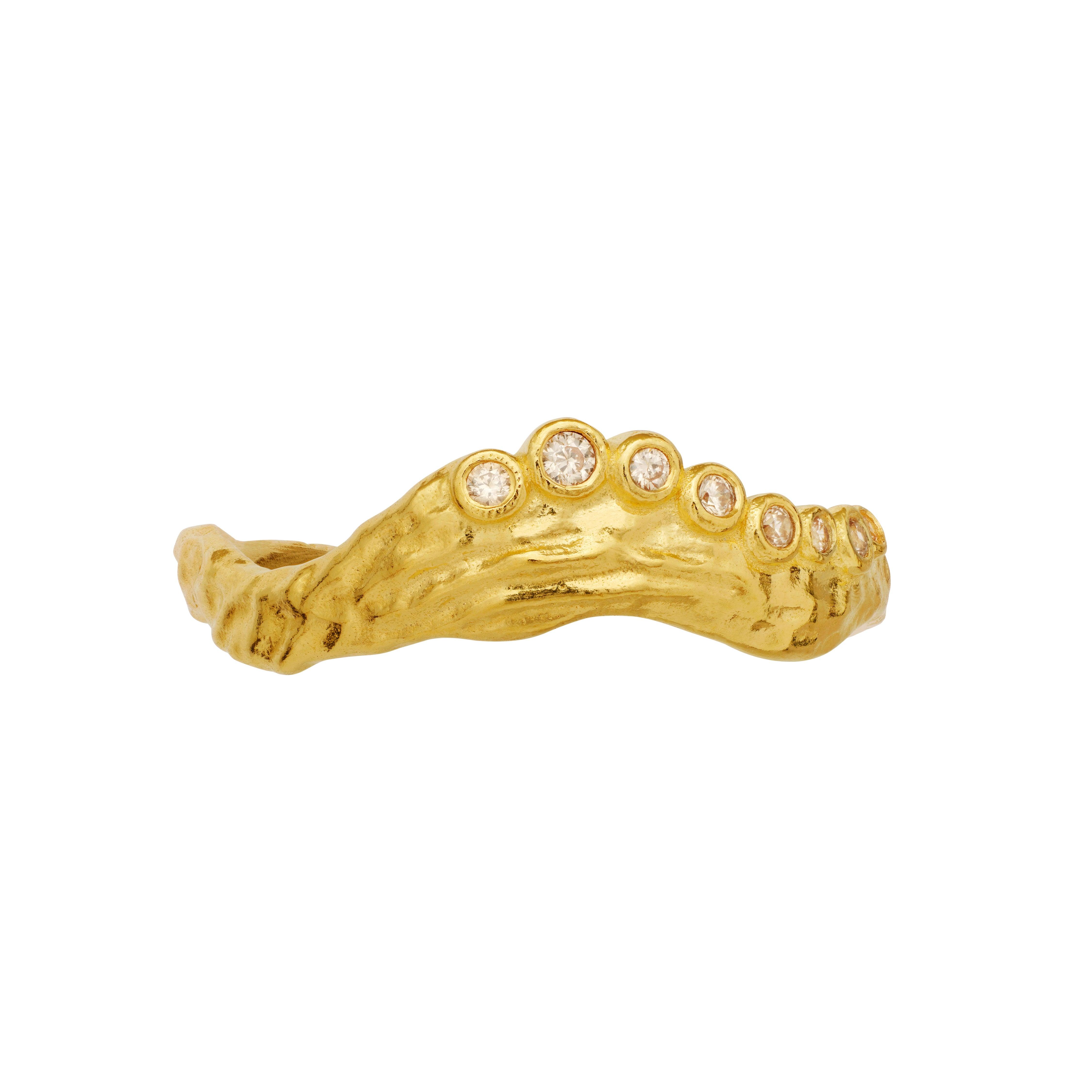 De maansteen Selene Ring kanaliseert de vrouwelijke energie van de maan met zijn gebogen ronding en elegante, meanderende oppervlak. De omlijste champagne zirkonia en witte zirkonia van de ring zorgen voor zowel helderheid als kracht, terwijl ze tegelijkertijd een buitenaardse gratie uitstralen. Deze ring is gemaakt van gerecycled sterlingzilver (925) en verguld met 18K goud en combineert tijdloze elegantie met moderne schoonheid, waardoor hij een perfect symbool is van vrouwelijkheid en kracht.
