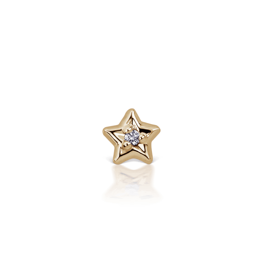 De kleine ster van MARIA TASH heeft in het midden een kleine diamant geplaatst. De achterkant is een bloem die met zijn schroefdraad gemakkelijk op en af geschroefd kan worden.