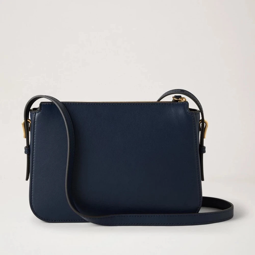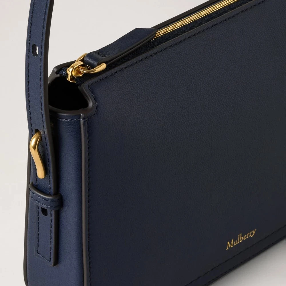 The bag is made of exclusive Micro Classic Grain leather in the color Night Sky (dark blue), which gives a bright, elegant and luxurious look. It has a practical zip closure, a removable and adjustable shoulder strap, as well as fine soft gold details that emphasize the timeless design. The embossed Mulberry logo on the front adds a discreet touch of exclusivity.