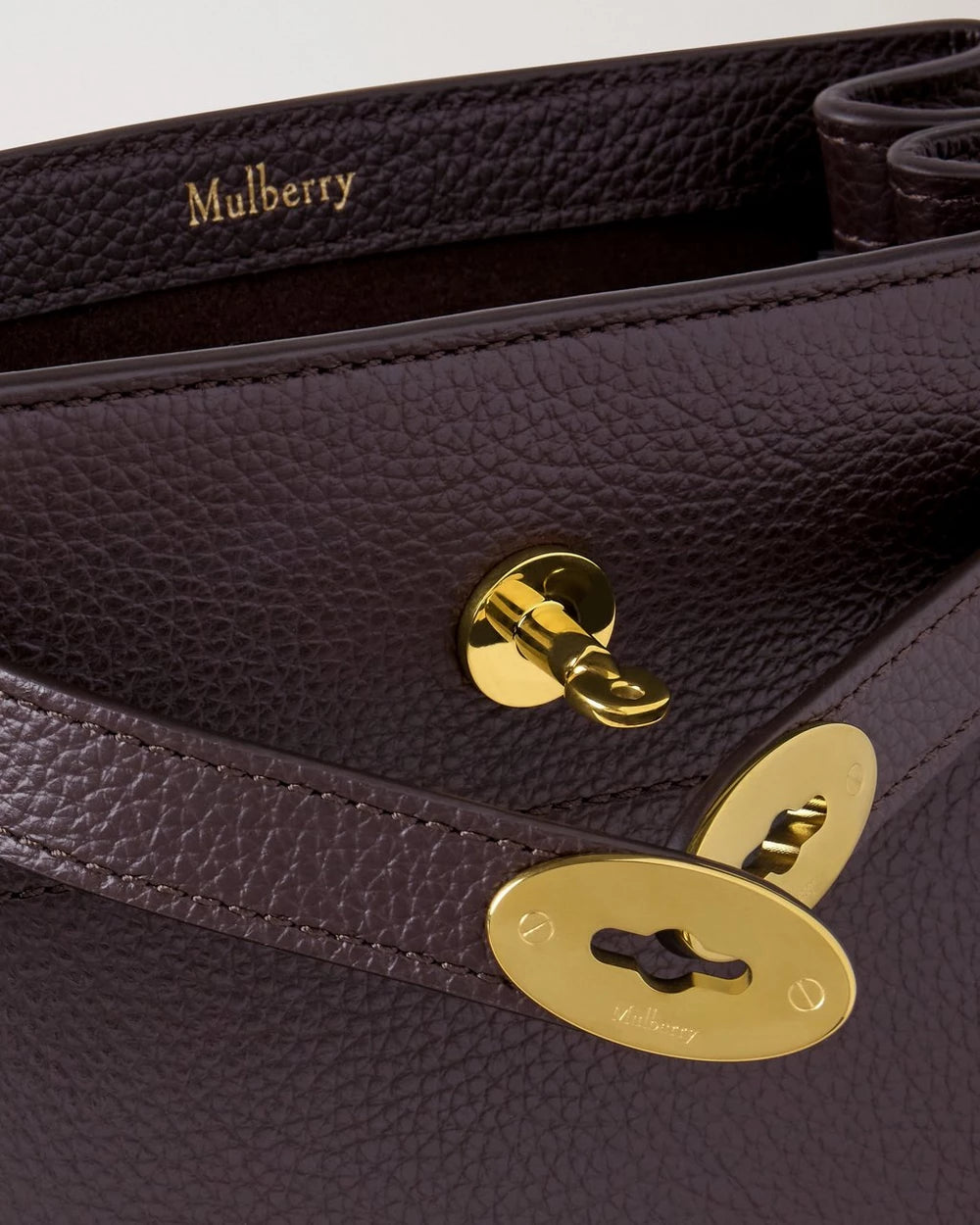 - Details: Messing hardware, reliëf Mulberryembleem binnen