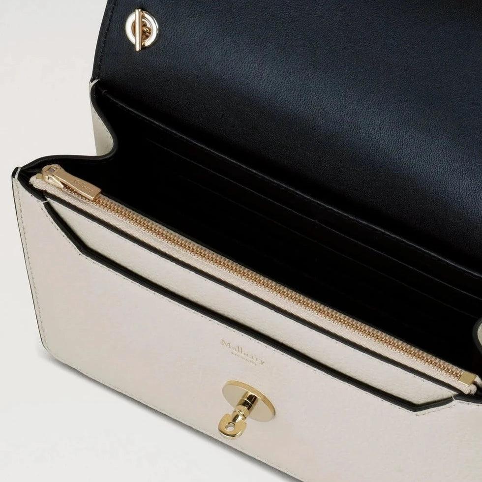 Klein Darley in de kleur Krijt van Mulberry, heeft het iconische postbodeslot in Soft Gold hardware. Door de eenvoudige en klassieke uitstraling kun je hem zowel voor het dagelijks leven als voor feestjes gebruiken. Er is plaats voor acht creditcards en een praktisch ritsvak.