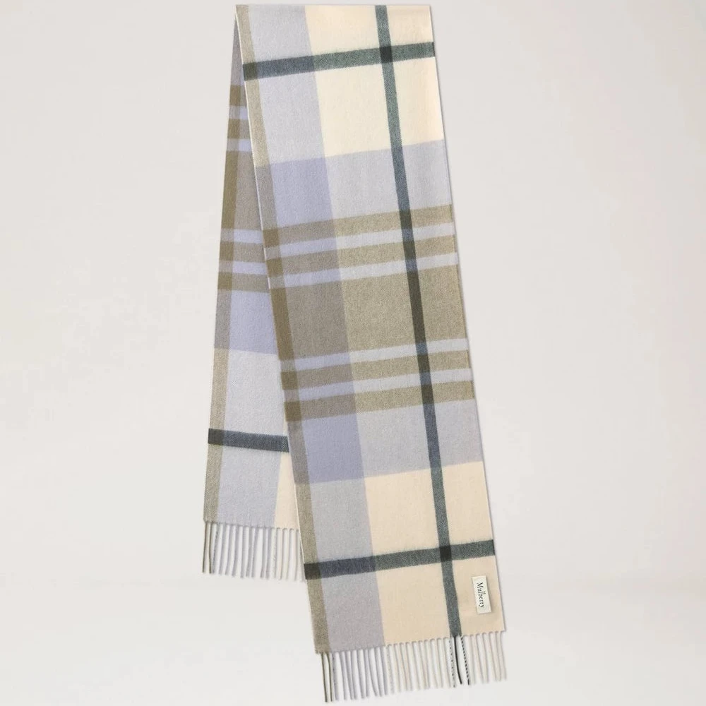 De mooie Mulberry Kleine geruite merinowollen sjaal in de kleuren Eggshell & Olive is een klassieke Britse sjaal gemaakt van 100% zachte merinowol. Het geweven ruitpatroon geeft een tijdloze uitstraling, terwijl het fijn geborduurd is Mulberrysignature en de zachte franjes aan de uiteinden zorgen voor een elegante touch.