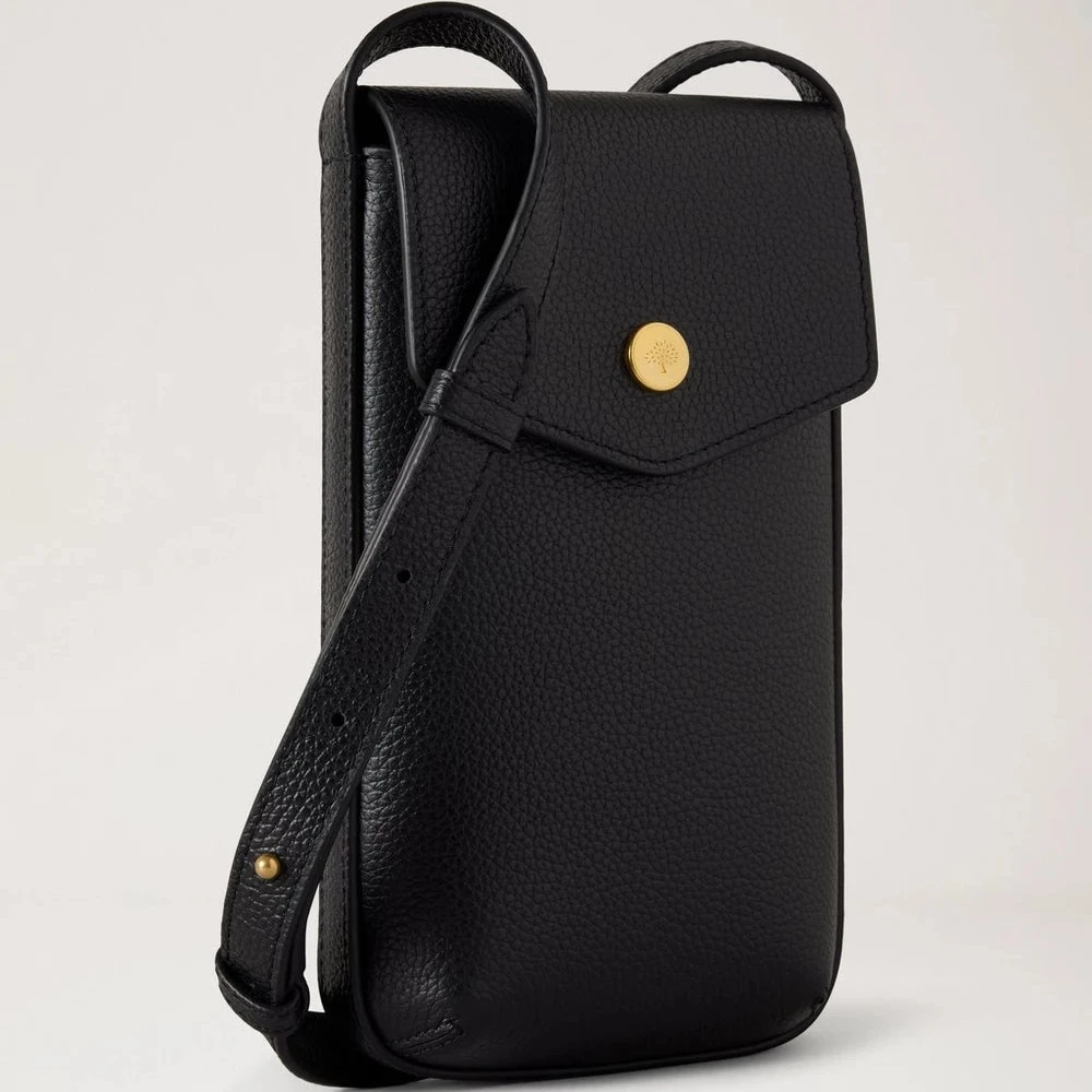 De elegante Mulberry Press Stud Phone Pouch in de kleur Black Small Classic Grain combineert functionaliteit en stijl in één compact ontwerp. Deze klassieke mobiele portemonnee is ideaal voor wie zijn telefoon veilig en met een luxe uitstraling wil opbergen.