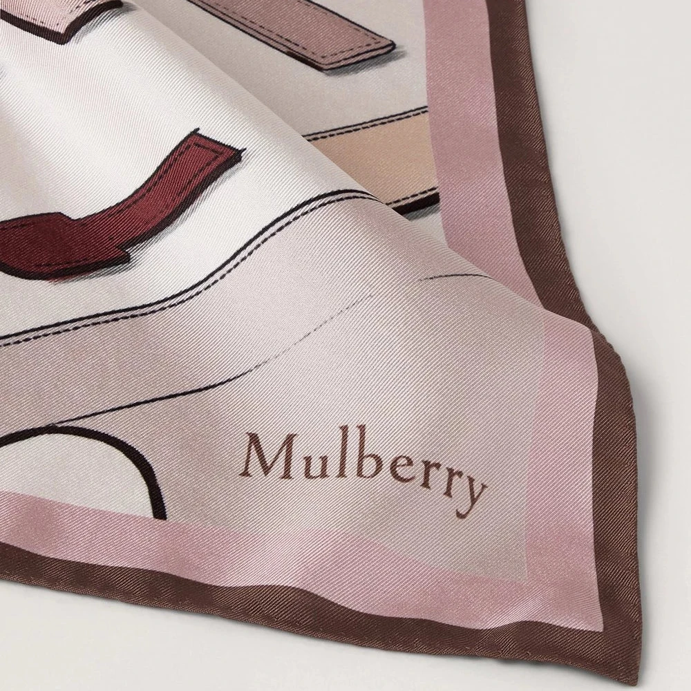 Het veelzijdige design maakt hem perfect om om de nek te dragen voor een verfijnde look - of als mooi detail op je favoriete tas Mulberry. De zachtroze tint en fijne print zijn geïnspireerd op de iconische Mulberry Bayswater Workshop, en geeft een elegant kleuraccent aan elke outfit.