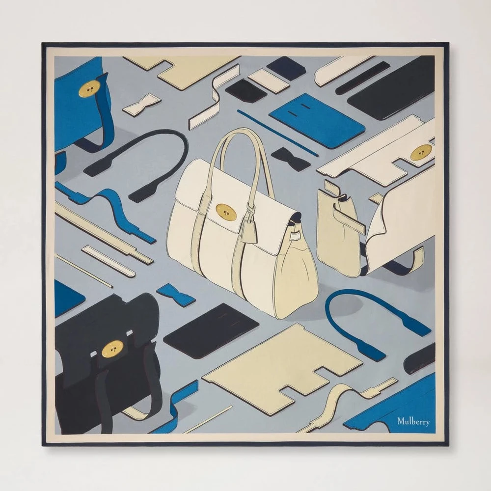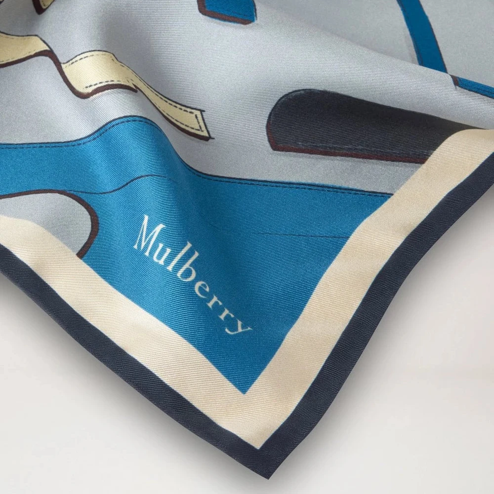Het vierkante ontwerp biedt vele gebruiksmogelijkheden - draag hem elegant om de nek, in het haar of als verfijnde touch aan je favoriete tas van Mulberry. De lichtgrijze tint geeft een tijdloze en verfijnde expressie, geïnspireerd op de iconische Mulberry Bayswater Workshop universum.