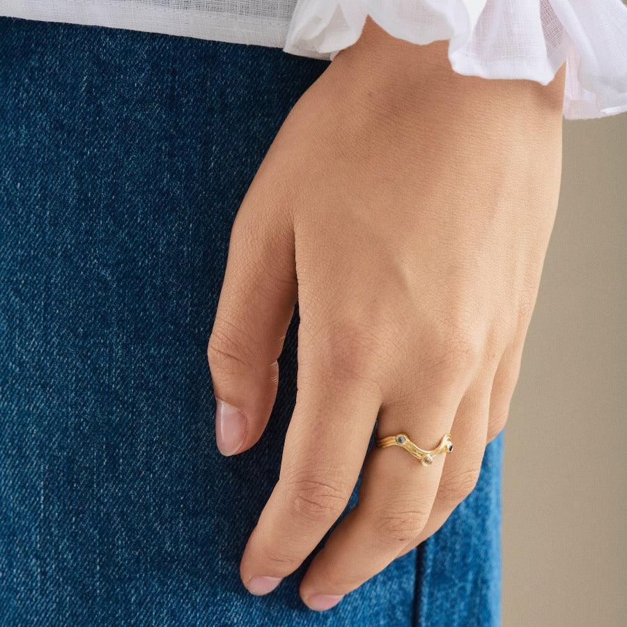 De prachtige Hellie ring van Pernille Corydon heeft een organisch en fantasierijk design. De golvende vormen en de fijne stenen geven een gevoel van de met ijs bedekte landschappen van het noorden.