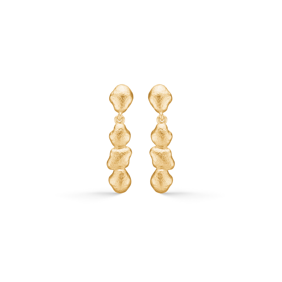 Lumi oorbellen in 925 sterling zilver met 18 kt. verguldsel. Geïnspireerd door vers gevallen sneeuw, brengt het ontwerp kleine organische vormen samen voor een elegante en rustige uitstraling. De matte textuur vangt het licht discreet op, terwijl de onderste schakel vrij beweegt en de look tot leven brengt. De oorbellen zijn 22 mm groot en kunnen alleen worden gedragen of samen met anderen worden gestyled voor een persoonlijke stapel.