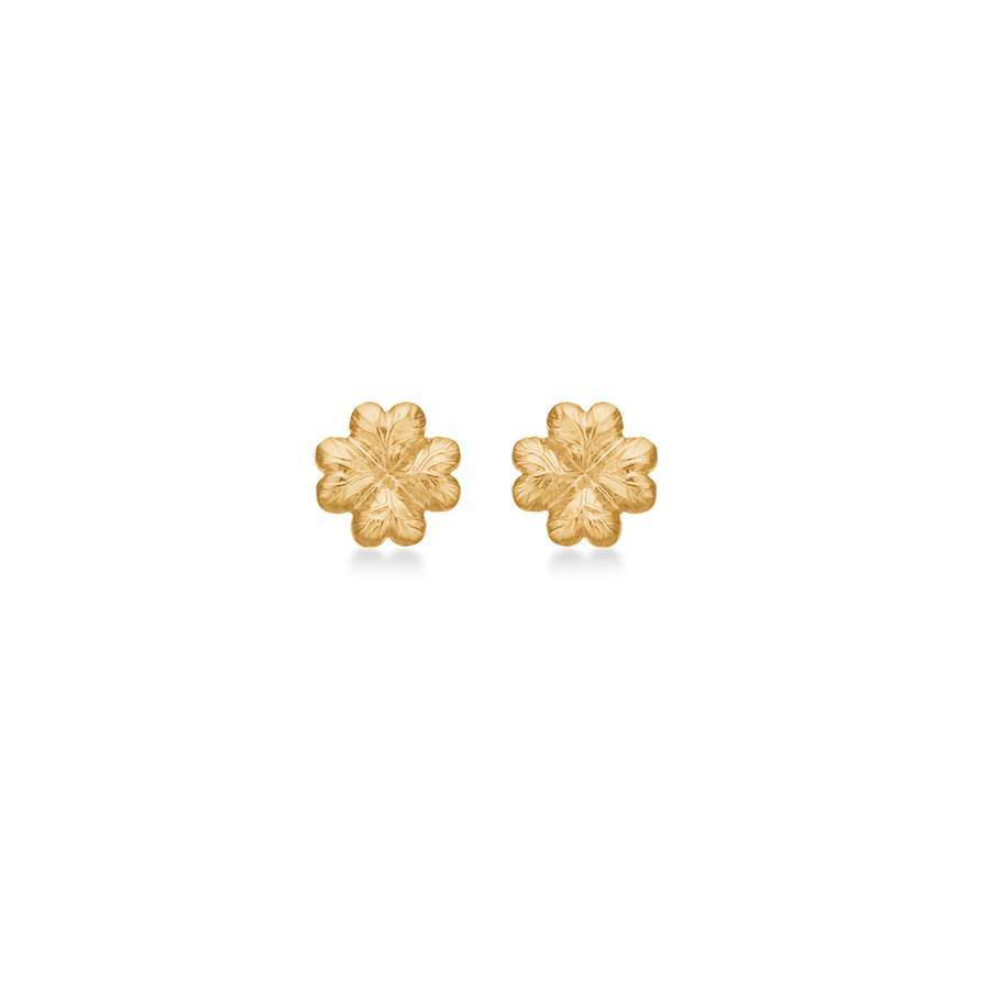 Serene Clover-oorbellen van 925 sterling zilver met 18kt. vergulden. Fijne klaveroorbellen met hartvormige blaadjes en een licht gestructureerd oppervlak die een vrouwelijke uitstraling combineren met een subtiele, rauwe twist. De oorbellen zijn 5 mm groot en zijn perfect voor dagelijks gebruik of als discreet detail in laag-op-laag styling.